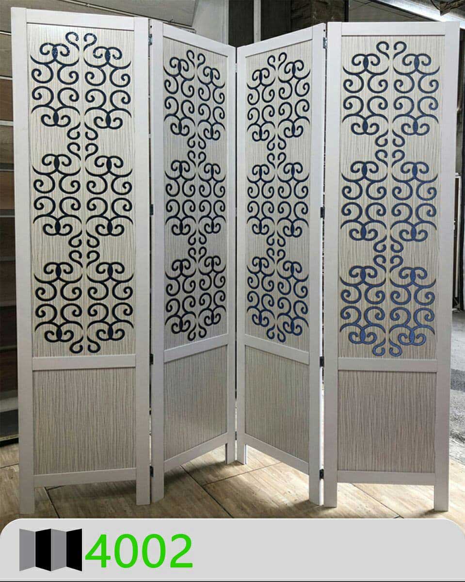 پاراوان دو جداره طلق و برش لیزری کد 4002 با تنوع در انتخاب رنگ پروفیل(سفید، طلایی، ونگه)، صفحه(سفید، طلایی، ونگه) و طلق(آبی، قرمز، سبز، نارنجی، سفید).
